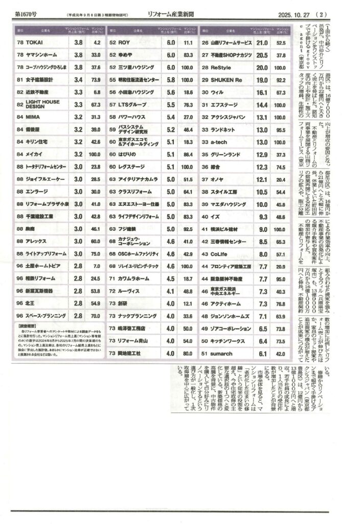『リフォーム産業新聞』2025年度 売上ランキングで第4位を獲得