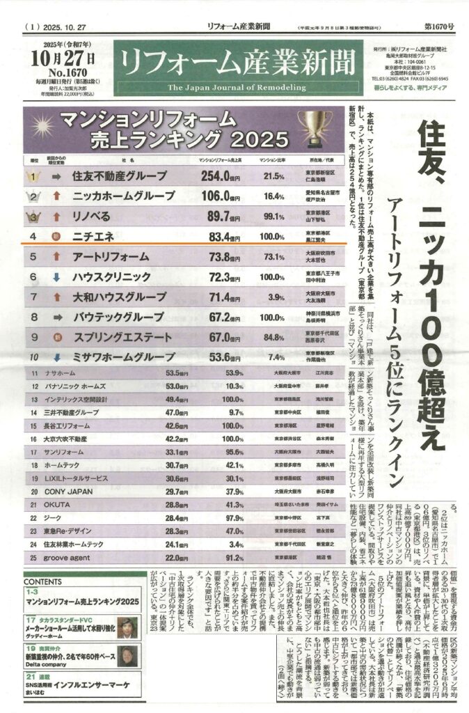 建設業界の専門紙『リフォーム産業新聞』が発表した2025年度の売上ランキングにおいて、ニチエネ(西日本を含む)はマンション専有部の設備全般分野で第4位に選出されました。