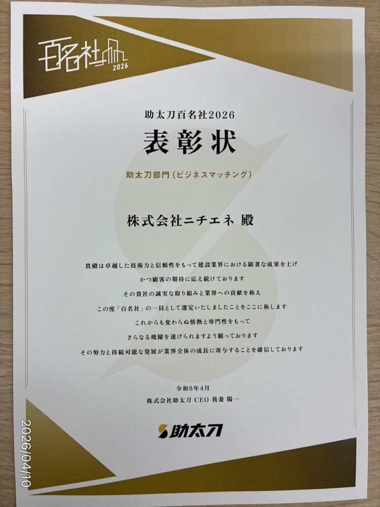 このたびニチエネは、助太刀様が選定する「助太刀百名社2026」に選出されました。昨年に続き、2年連続での受賞となります。